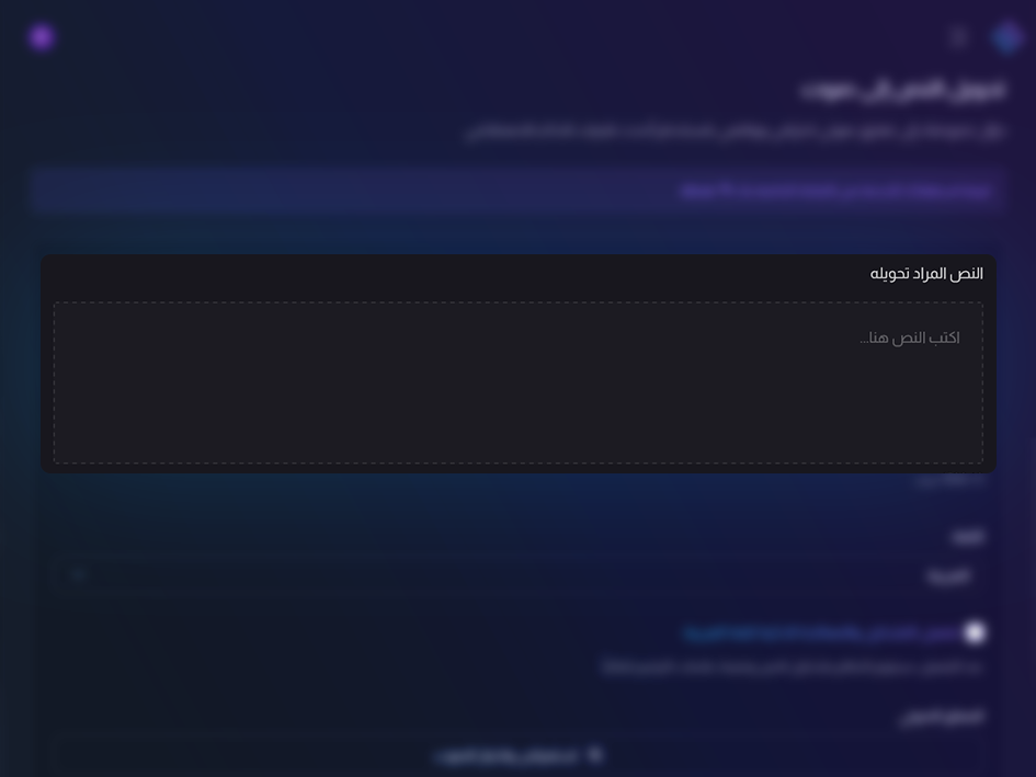 أدخل نصك في المساحة المخصصة، واستخدم ميزة التشكيل الذكي لضمان نطق اللغة العربية بدقة متناهية، مما يمنح تعليقك الصوتي طابعاً رسمياً واحترافياً فائق الجودة والوضوح التام.