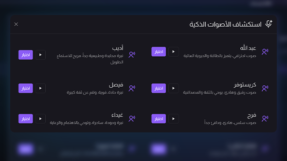 استكشف مكتبة الأصوات الذكية المتنوعة واختر النبرة التي تناسب محتواك، سواء كانت درامية، حيوية، أو هادئة، لتضمن وصول رسالتك بالروح المطلوبة تماماً وبشكل مؤثر.